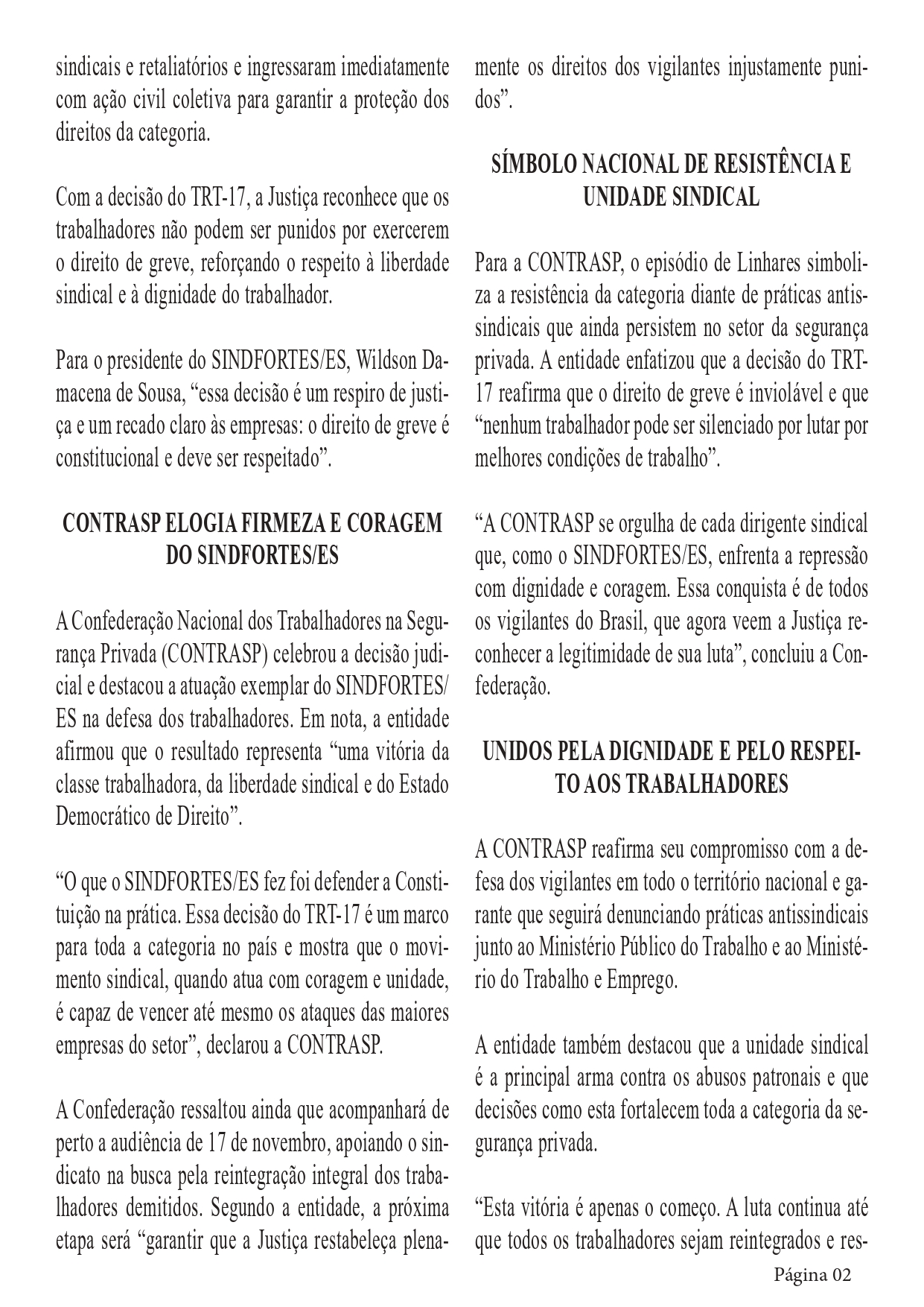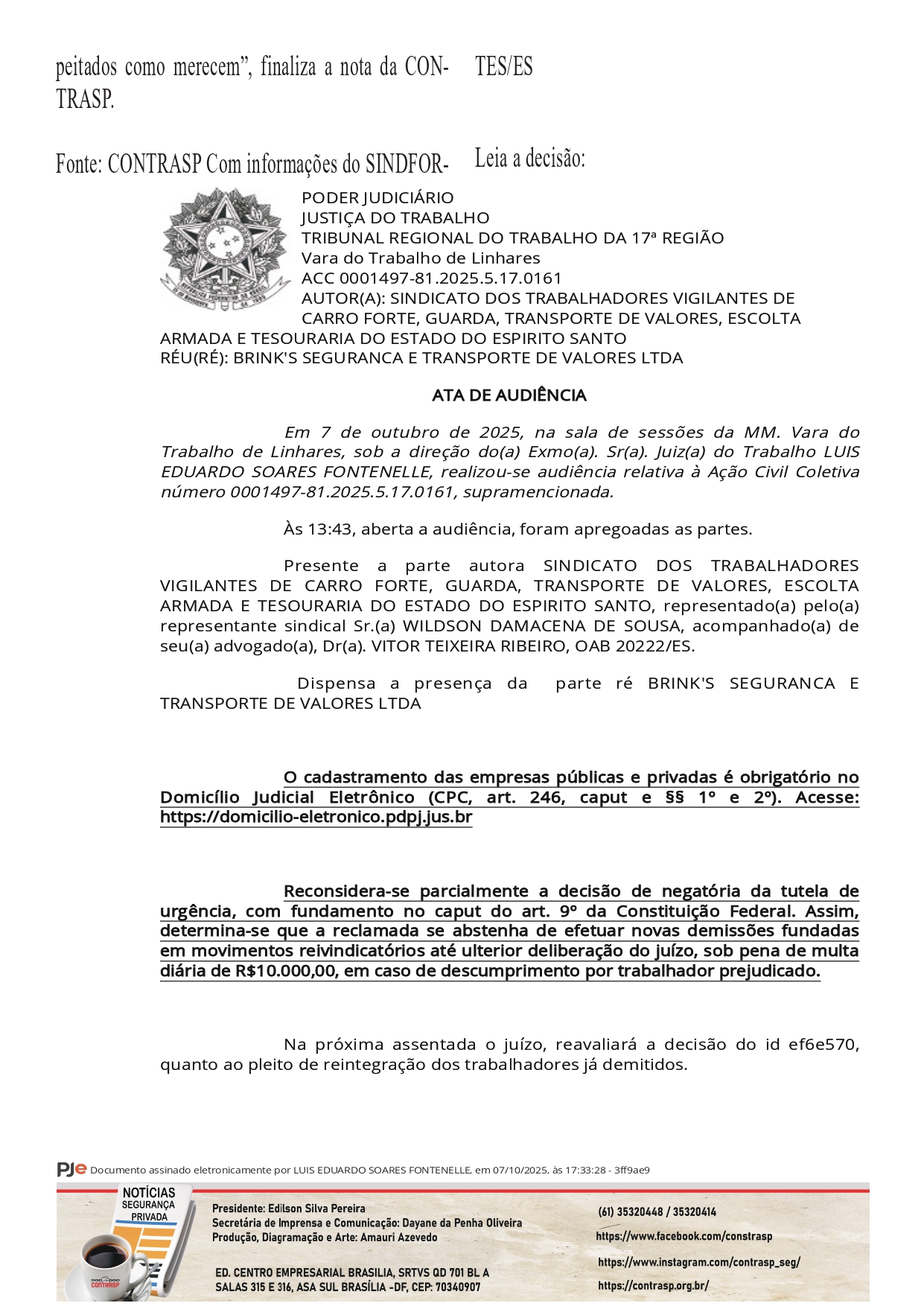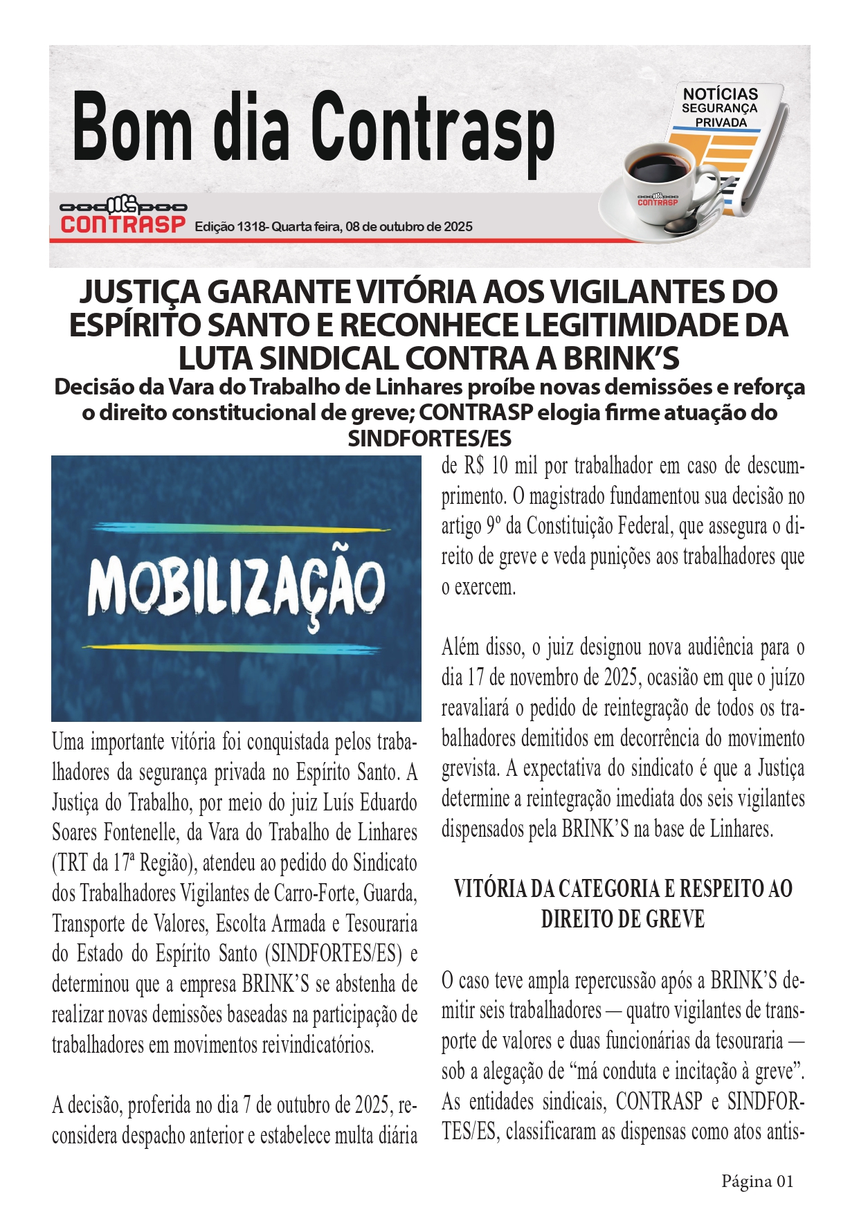 Justiça garante vitória aos Vigilantes do Espírito Santo e reconhece legitimidade da luta sindical contra a Brink’s