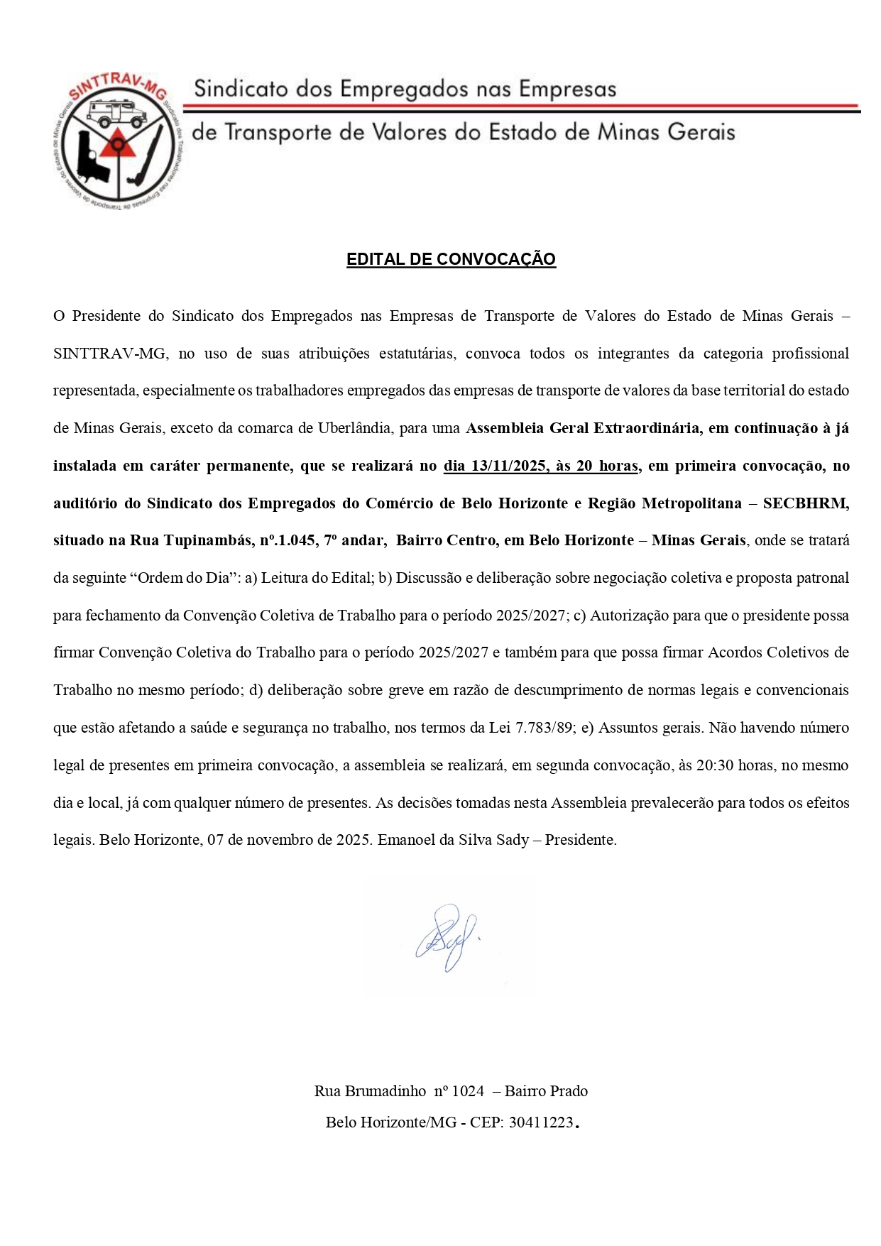 A direção do SINTTRAV convoca a todos os trabalhadores nas Empresas de Transporte de Valores das bases de Minas Gerais, exceto Uberlândia, para Assembleia Geral Extraordinária que se realizará no dia 13/11/2025 (quinta-feira) às 20h em primeira convocação, no Auditório do Sindicato dos Comerciários SECBHRM, situado na rua dos Tupinambás, 1045 no 7º andar onde iremos decidir e deliberar rumo das negociação e assuntos gerais.