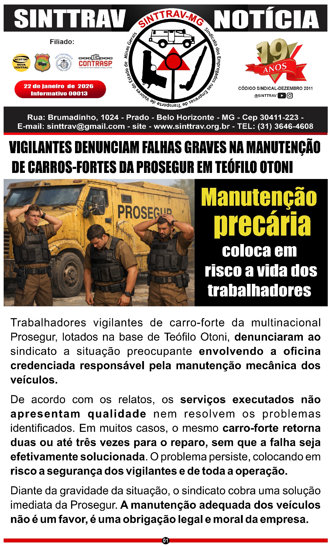 Vigilantes denunciam falhas graves na manutenção de carros-fortes da Prosegur em Teófilo Otoni